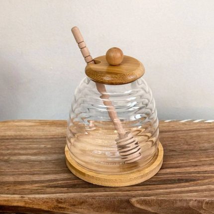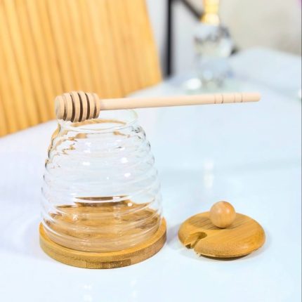 Pot à Miel en Verre Transparent avec Couvercle en Bois et Cuillère en Bois – Design Raffiné