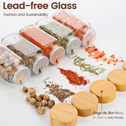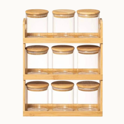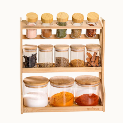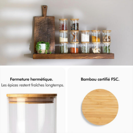Set de 9 bocaux à épices en verre avec support en bambou et couvercles hermétiques