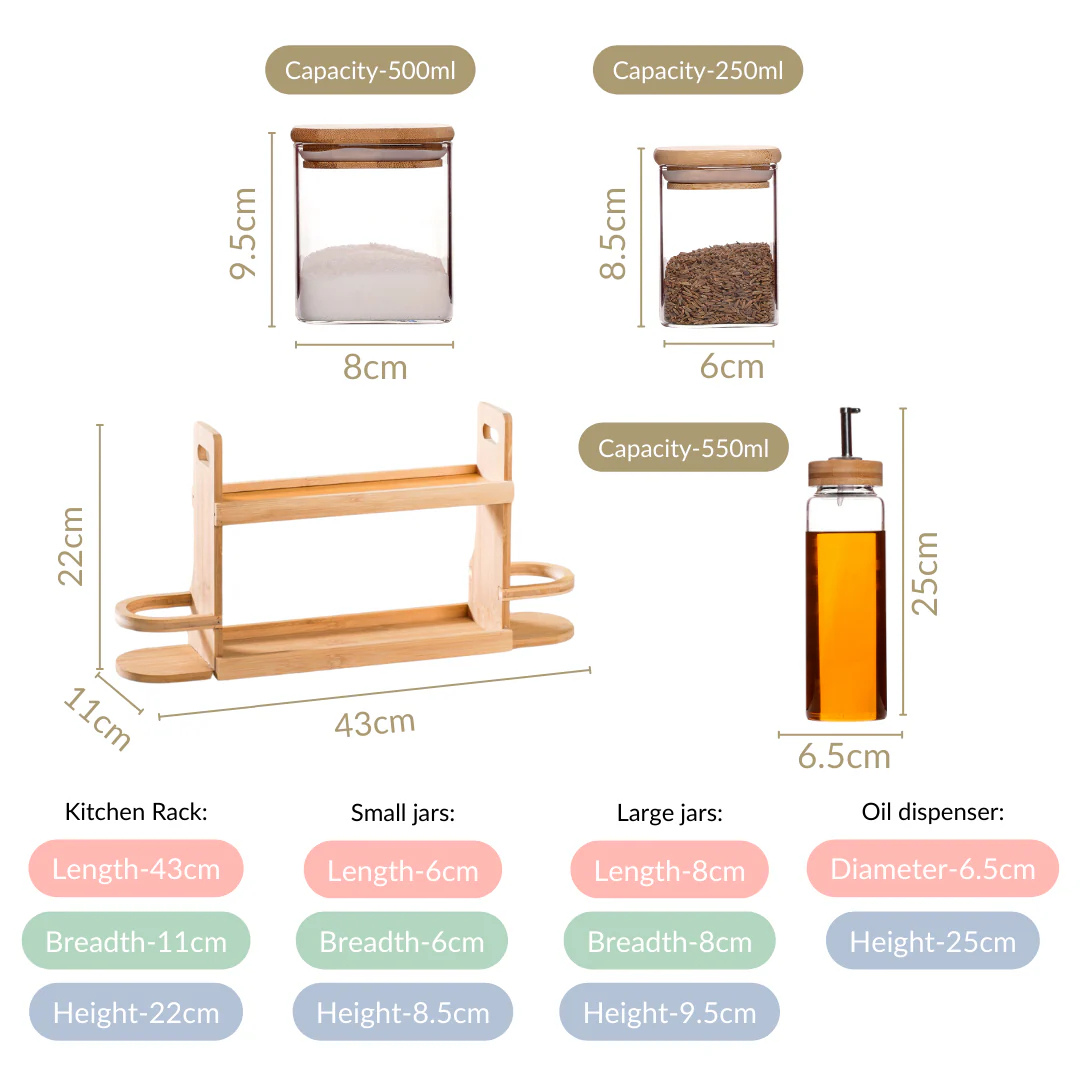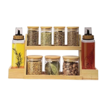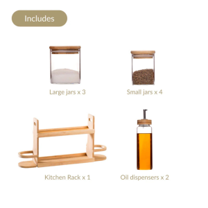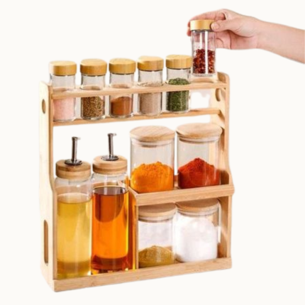 - Compartiment inférieur : deux supports incurvés accueillent des distributeurs d’huile en verre, tandis que trois bocaux en verre avec couvercles en bambou s’intègrent parfaitement au centre.