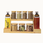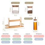 - Compartiment supérieur : quatre petits pots à épices en verre reposent sur une planche fine, tous munis de couvercles en bambou hermétiques. Chaque élément est équipé de joints en silicone pour une étanchéité optimale, et les distributeurs d’huile sont dotés de becs verseurs en acier inoxydable, garantissant un dosage précis et sans coulure.